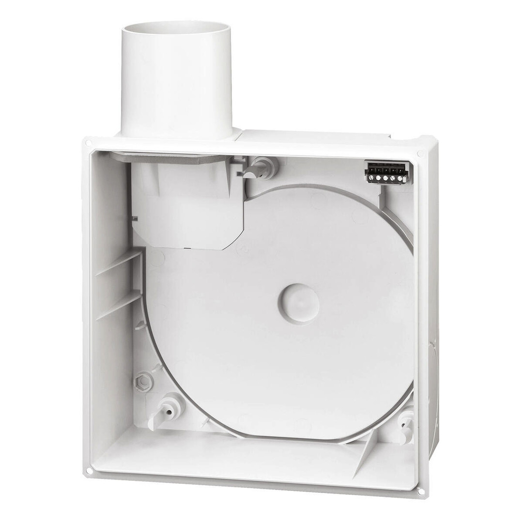 Unterputzgehäuse ohne Brandschutz, mit luftdichter Rückschlagklappe. Ausblasstutzen seitlich, nach oben (Lieferweise), links oder rechts drehbar. Mittels Zubehör-Set (-ARS, Best.-Nr. 8185) umsteckbar für rückseitigen Luftaustritt in beliebiger Position. Steckverbindung für elektrischen Anschluss herausnehmbar. Aus Kunststoff in Brandklasse B 2. Wieder einsetzbarer Klapp-Putzdeckel. Anschluss DN 80 mm. Einsatzgebiet Zur Lüftung von Bad oder WC, mittels Zubehör-Set auch für Zweiraumlüftung von Bad und WC. UP-Einbau in Wand, Decke oder Installationsschächte. Anschluss von 1 oder 2 Geräten an gemeinsame Hauptleitung bis zu 20 Geschossen. Brandschutz durch Einsatz von Deckenschotts herstellbar.