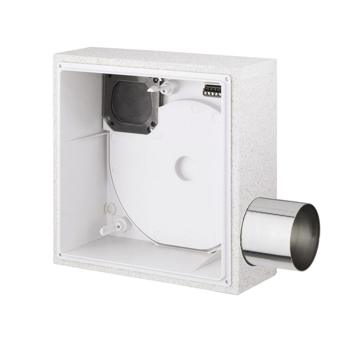 Unterputzgehäuse mit Brandschutz-Ummantelung K 90 und Zweitraumanschluss rechts. Ausblasstutzen für Hauptraum rückseitig und um 90° beliebig drehbar. Metall-Ausblasstutzen mit selbsttätiger Rückschlagklappe und Absperrung bei Schmelzlotauslösung*. Steckverbindung für elektrischen Anschluss herausnehmbar. Wieder einsetzbarer Klapp-Putzdeckel. Anschluss DN 80 mm. Einsatzgebiet Zweiraumlüftung von Bad und WC. Einbau in Wand, Decke und K 90 qualifizierte Lüftungsschächte. Anschluss von 1 oder 2 Gehäusen pro Etage bis zu 20 Vollgeschossen möglich. Ventilator-Einsatz mit 100 m3/h empfohlen. *Die Rückschlagklappe bei Brandschutzgehäusen erfüllt grundsätzlich auch die Anforderungen einer Kaltrauch-Absperrklappe.
