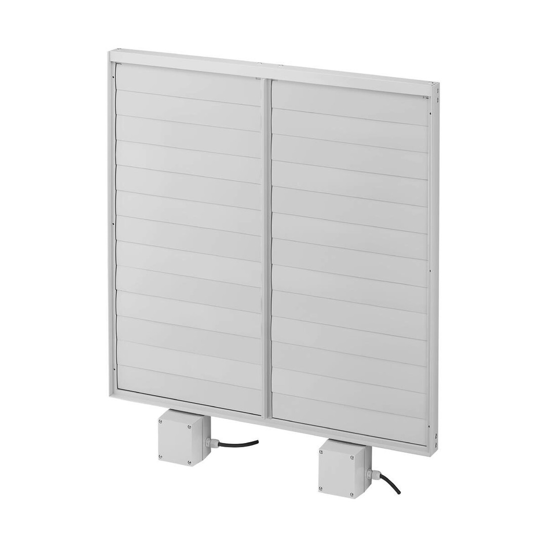 Zur Abdeckung von Zu- und Abluftöffnungen. Rahmen, Lamellen und Stellglieder aus hellgrauem Kunststoff, Stellwerkgehäuse in IP 45 für Montage im Freien. Je nach Größe variiert die Anzahl der Lamellen. Mit zwei Stellmotoren ausgestattet. Steuerung automatisch mit Ventilator: Ortsgebundener Wechselschalter schaltet die Stellmotoren, die über einen Endschalter den Ventilatorkreis schalten. Stellwerk komplett verdrahtet, mit 1,5 m Anschlusskabel ausgerüstet. 230 V, 50/60 Hz.