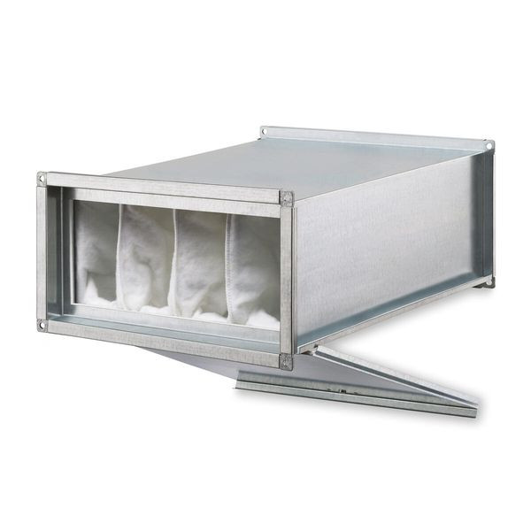 Gehäuse aus verzinktem Stahlblech mit beidseitigem Anschlussflansch zum Einbau im Kanalverlauf. Taschenfilter-Kasette auf tragendem Rahmen für hohe Staubaufnahme, großflächig dimensioniert. Filter aus synthetischem Kunststoff, Klasse F 7, DIN 53438 F1, selbstverlöschend. Abscheidegrad: ca. 98%, Staubeinspeicherung: 88,6 g/m². Montage in beliebiger Lage.