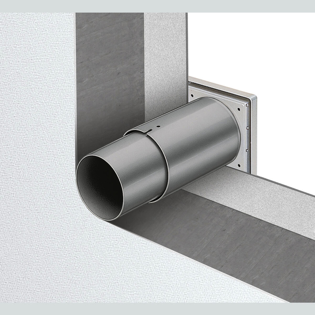 Bestehend aus zwei, ineinanderschiebbaren Kunststoffrohren. Für UP-Einbau, von 260 bis 500 mm passend. Außenwandabschluß über Rahmen mit drei Lamellen als selbsttätige Verschlußklappe.. Alle Teile aus Kunststoff, im Lieferumfang enthalten.