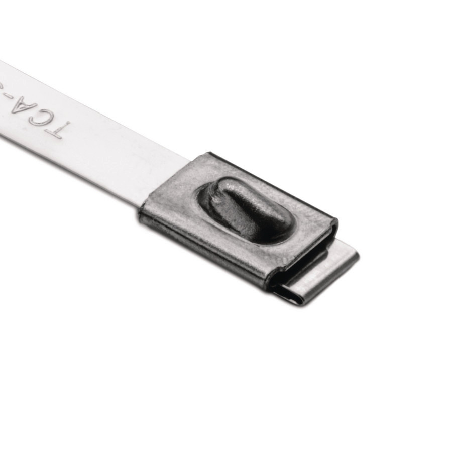 Kabelbinder MBT aus rostfreiem Edelstahl SS316, mit patentiertem, unlösbaren Verschlusskopf, gegabeltes Bandende für leichtes Einschlaufen, hervorragende chemische Beständigkeit, Korrosions- und witterungsbeständig, Antimagnetisch, hochtemperaturbeständig, nicht brennbar