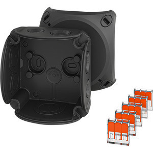 Kabelabzweigkasten aus hochwertigem Thermoplast. Für Aufputz-Anwendungen in Gebäuden oder die geschützte Installation im Freien. Mit Außenlaschen zur Befestigung und Deckelbefestigung über Schnellverschlüsse. Mit Wago-Compact-Verbindungsklemme 221-413 und Befestigungsadaptern. Kabeleinführung über elastische Dichtmembranen in Gehäusewänden und Boden. Nachträglicher Einsatz von Kabelstutzen durch Entfernen der Dichtmembrane möglich.