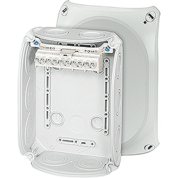 Kabelabzweigkasten aus hochwertigem Thermoplast. Für Aufputz-Anwendungen in Gebäuden oder die geschützte Installation im Freien. Mit Außenlaschen zur Befestigung und Deckelbefestigung über Schnellverschlüsse. Mit innovativer Klemmentechnik bis 6 mm², 5-polig. Kabeleinführung über elastische Dichtmembranen in Gehäusewänden und Boden. Nachträglicher Einsatz von Kabelstutzen durch Entfernen der Dichtmembrane möglich. Mit Deckelhalteband.