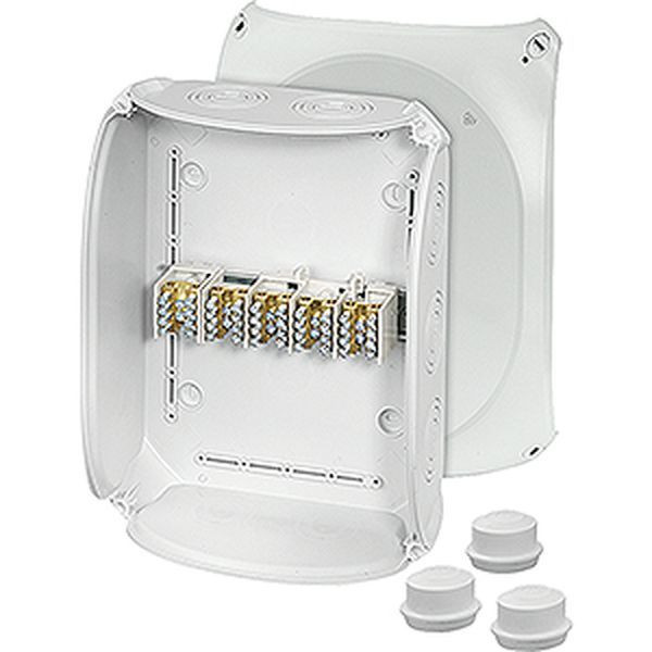 Kabelabzweigkasten aus hochwertigem Thermoplast mit Hauptleitungsabzweigklemmen für Kupferleiter. Für Aufputz-Anwendungen in Gebäuden oder die geschützte Installation im Freien. Mit Außenlaschen zur Befestigung und Deckelbefestigung über Schnellverschlüsse. Mit Hauptleitungsabzweigklemmen bis 25 mm², 5-polig. Kabeleinführung über metrische Vorprägungen in Gehäusewänden und Boden. Beigefügte Einsteckstutzen in Schutzart IP 55.