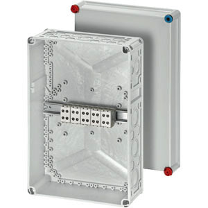 Kabelabzweigkasten aus hochwertigem Thermoplast mit Klemmen für Aluminium- und Kupferleiter. Für Aufputz-Anwendungen in Gebäuden oder die geschützte Installation im Freien. Kabelstutzen und Anbauflansche im Zubehör. Mit Klemmen bis 50 mm², 5-polig. Kabeleinführungen über metrische Vorprägungen in Gehäusewänden.