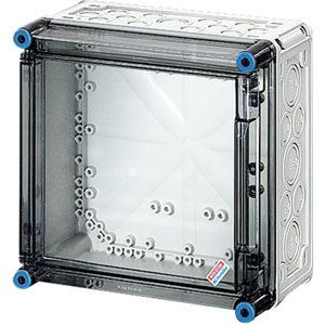 mit Scharnierdeckel Gehäuse für den Bau von Energie-Schaltgerätekombinationen bis 630 A oder als Einzelgehäuse. Aus hochwertigem Polycarbonat schutzisoliert. Wanddurchführungen mit großen Öffnungen für die elektrische Verbindung der Gehäuse untereinander. Kabeleinführung an allen Gehäusewänden über metrische Vorprägungen oder Anbauflansche. Gehäuse zur Wandbefestigung auch über Außenlaschen oder mit Montageschienen. Leergehäuse mit transparentem Deckel. Einbaumaße B 275 x H 275 x T 119 mm für den Einbau von Geräten auf Montageplatte oder DIN-Tragschiene. Max. Einbautiefe bei eingebauter Montageplatte 115 mm, bei eingebauter Tragschiene 104 mm. Deckelverschlüsse mit Werkzeugbetätigung.