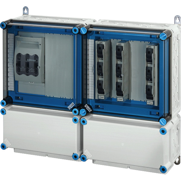 Wechselrichter-Sammler nach IEC 61439 für PV-Anlagen werden als Komplett-Set geliefert. Die Gehäuse aus hochwertigem Thermoplast sind schutzisoliert, Schutzart IP 54/IP 65. Wechselrichter-Sammler können um die Funktion Blitz- und Überspannungsschutz oder Fehlerstromschutz (RCD) erweitert werden. Sie sind für die geschützte Installation im Freien geeignet und UV-beständig. PV-Wechselrichter-Sammler bis 70 kVA mit Lasttrennschalter für Sicherung 63 A, D02. Max. 9 x 1~ Wechselrichter oder 3 x 3~ Wechselrichter. Wandbefestigung über Außenlaschen aus Edelstahl.