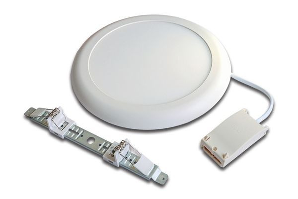 Ein- / Anbaustrahler mit Flächenlicht Gehäuse Kunststoff, inkl. Anschlussklemme für 230V mit integrierter Durchgangsverdrahtung, Lichtfarbe xw (extra warm weiß) ca. 2700K, schnelle und einfache Montage durch verstellbare Federklemmen für Bohrungen von 65 bis 205mm, dimmbar mit Phasendimmer