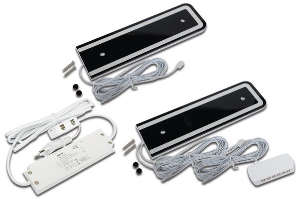 Design LED-Unterbauleuchte mit homogenem Flächenlicht als 2er Set, Gehäuse Metall, Anschlussleitung 2,5m mit LED 24-Stecker, incl. steckerfertigem Trafo, Lichtfarbe warm weiß ca. 3000K, inkl. berührungsloser IR-Dimmer