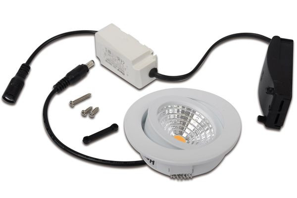 Schwenkbarer LED-Einbaustrahler, Metall-Gehäuse, incl. dimmbarem LED-Trafo mit Anschlussklemme für 230V mit integrierter Durchgangsverdrahtung, schnelle und einfache Montage durch Federklemmen, schwenkbar um je 20°