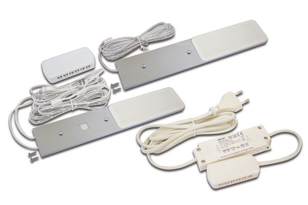 LED-Unterbauleuchte mit homogenem Flächenlicht als 2er Set, Gehäuse Metall, Anschlussleitung 2,5m mit LED 24-Stecker, inkl. steckerfertigem Trafo, Lichtfarbe neutral weiß ca. 4000K, inkl. Touch-Dimmer