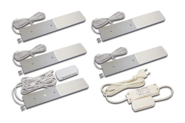 LED-Unterbauleuchte mit homogenem Flächenlicht als 5er Set, Gehäuse Metall, Anschlussleitung 2,5m mit LED 24-Stecker, inkl. steckerfertigem Trafo, Lichtfarbe neutral weiß ca. 4000K, inkl. Touch-Dimmer