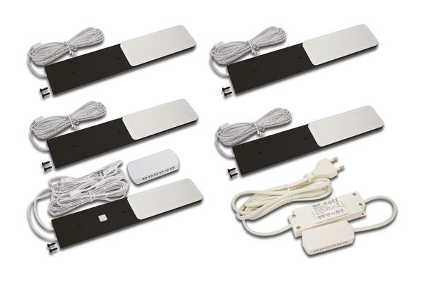 LED-Unterbauleuchte mit homogenem Flächenlicht als 5er Set, Gehäuse Metall, Anschlussleitung 2,5m mit LED 24-Stecker, inkl. steckerfertigem Trafo, Lichtfarbe warm weiß ca. 3000K, inkl. Touch-Dimmer