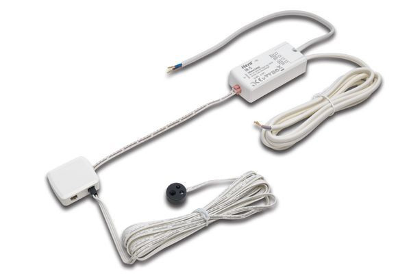 Berührungsloser IR-Schalter zum Anschluss von Leuchten-Betriebsgeräten der Schutzklasse II, Netzanschlussleitung 2m und Schaltleitung 0,3m jeweils abgemantelt und mit Aderendhülsen zum einfachen Anschließen an Schraub- oder Steckklemmen, Sensorleitung 3m mit Sensorkopf K59, Schalt-Funktion: Lichteinschaltung mit erster Bewegung, -ausschaltung mit folgender