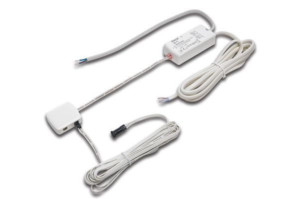 Berührungsloser IR-Schalter zum Anschluss von Leuchten-Betriebsgeräten der Schutzklasse II, Netzanschlussleitung 2m und Schaltleitung 0,3m jeweils abgemantelt und mit Aderendhülsen zum einfachen Anschließen an Schraub- oder Steckklemmen, Sensorleitung 3m mit Sensorkopf K60, Schalt-Funktion: Lichteinschaltung mit erster Bewegung, -ausschaltung mit folgender