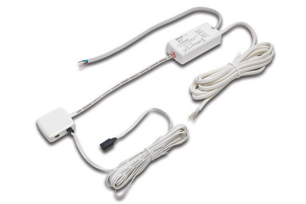 Berührungsloser IR-Schalter zum Anschluss von Leuchten-Betriebsgeräten der Schutzklasse II, Netzanschlussleitung 2m und Schaltleitung 0,3m jeweils abgemantelt und mit Aderendhülsen zum einfachen Anschließen an Schraub- oder Steckklemmen, Sensorleitung 3m mit Sensorkopf K80, Schalt-Funktion: Lichteinschaltung mit erster Bewegung, -ausschaltung mit folgender
