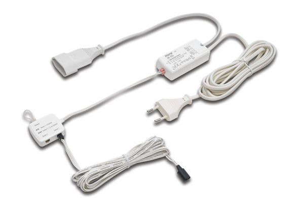 Berührungsloser Türkontakt-Schalter zum Anschluss von Leuchten-Betriebsgeräten der Schutzklasse II, Anschlussleitung 3m mit Eurostecker, Schaltleitung 0,3m mit Eurokupplung, Sensorleitung 3m mit Sensorkopf K80, Schalt-Funktion: Beim Öffnen der Tür schaltet sich das Licht ein und beim Schließen der Tür wieder aus.