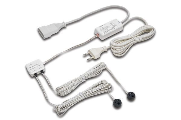 Berührungsloser Türkontakt-Schalter zum Anschluss von Leuchten-Betriebsgeräten der Schutzklasse II, Anschlussleitung 3m mit Eurostecker, Schaltleitung 0,3m mit Eurokupplung, zwei Sensorleitungen 3m mit Sensorkopf K59, Schalt-Funktion: Beim Öffnen einer der beiden Türen schaltet sich das Licht ein und beim Schließen beider Türen wieder aus.