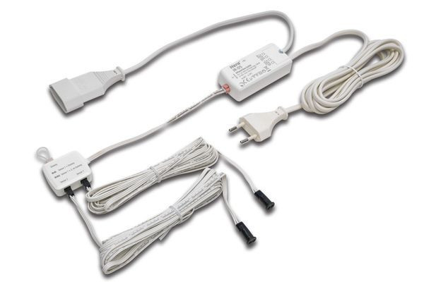 Berührungsloser Türkontakt-Schalter zum Anschluss von Leuchten-Betriebsgeräten der Schutzklasse II, Anschlussleitung 3m mit Eurostecker, Schaltleitung 0,3m mit Eurokupplung, zwei Sensorleitungen 3m mit Sensorkopf K60, Schalt-Funktion: Beim Öffnen einer der beiden Türen schaltet sich das Licht ein und beim Schließen beider Türen wieder aus.