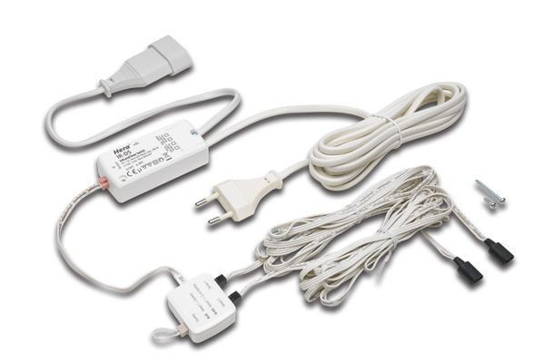 Berührungsloser Türkontakt-Schalter zum Anschluss von Leuchten-Betriebsgeräten der Schutzklasse II, Anschlussleitung 3m mit Eurostecker, Schaltleitung 0,3m mit Eurokupplung, zwei Sensorleitungen 3m mit Sensorkopf K80, Schalt-Funktion: Beim Öffnen einer der beiden Türen schaltet sich das Licht ein und beim Schließen beider Türen wieder aus.