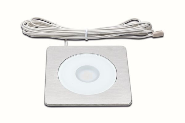 LED-Einbaustrahler, Gehäuse Aluminium, Anschlussleitung 2,5m mit LED 24-Stecker, Lichtfarbe warm weiß ca. 3000K, schnelle und einfache Montage durch Rasthaken, optionales Zubehör: Dimm-Controller mit Funkfernbedienung, WiFi App, DALI oder 1-10V Dimmer, Montagefeder zum Aufschrauben für den sicheren Halt in Leichtbaudecken