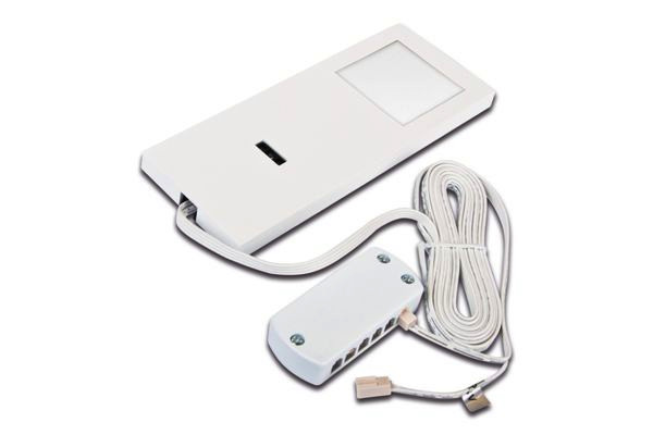 Quadratische, flache LED-Unterbauleuchte mit homogenem Flächenlicht, Gehäuse Kunststoff, Anschlussleitung 2,4m mit LED 24-Stecker, Lichtfarbe neutral weiß ca.4000K, incl. berührungsloser IR-Schalter mit NightLight Funktion (zusätzliche kleine LED zur Orientierung im Raum am IR-Schalter) optionales Zubehör: dimmbarer Trafo mit Funkfernbedienung oder 1-10V Dimmer