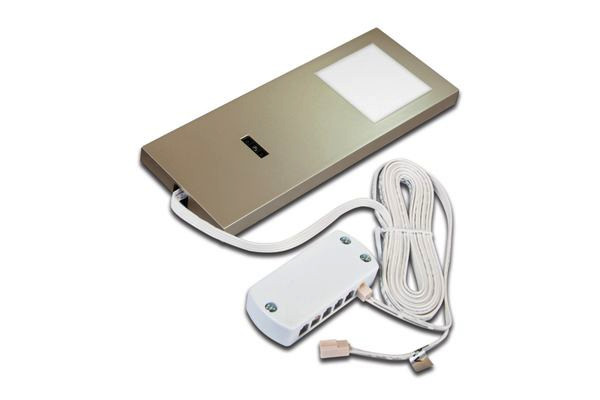 Quadratische, flache LED-Unterbauleuchte mit homogenem Flächenlicht, Gehäuse Kunststoff, Anschlussleitung 2,4m mit LED 24-Stecker, Lichtfarbe neutral weiß ca.4000K, incl. berührungsloser IR-Schalter mit NightLight Funktion (zusätzliche kleine LED zur Orientierung im Raum am IR-Schalter) optionales Zubehör: dimmbarer Trafo mit Funkfernbedienung oder 1-10V Dimmer