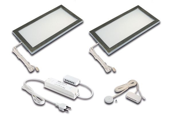 Quadratische, flache LED-Unterbauleuchte mit homogenem Flächenlicht, Gehäuse Kunststoff, als 2er Set, Anschlussleitung 2,5m mit LED 24-Stecker, Lichtfarbe warm weiß ca. 3000K, inkl. steckerfertigem 30W Trafo und unsichtbaren Sonar-Dimmer