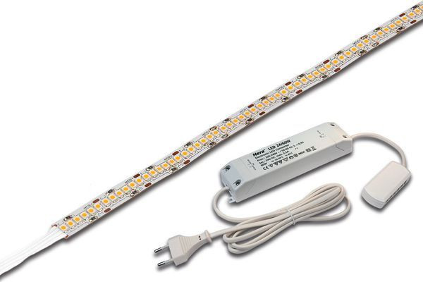 Flexibles LED-Band auf Rolle, Lichtfarbe warm weiß ca. 3000K, schnelle und einfache Montage durch das bereits aufgebrachte doppelseitige 3M Klebeband, inkl. Anschlussleitung 2,5m mit 2x LED 24-Stecker, das Band kann alle 25mm abgeschnitten werden (siehe Markierung), optionales Zubehör: Controller mit Funkfernbedienung, DALI, ZigBee oder WiFi App, Glaskantenprofil zur seitlichen Lichteinspeisung von Glasscheiben, Eckprofil, Montageprofil, Abdeckprofil oderEinfräsprofil