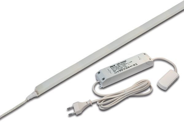 Flexibles LED-Band auf Rolle, Lichtfarbe extra warm weiß ca. 2700 K mit Flächenlicht ohne sichtbare LED Punkte, schnelle und einfache Montage durch das bereits aufgebrachte doppelseitige 3M Klebeband, inkl. Anschlussleitung 2,5 m mit LED 24-Stecker, das Band kann alle 50 mm abgeschnitten werden (siehe Markierung), optionales Zubehör: Dimm-Controller mit Funkfernbedienung, 1-10V, DALI, ZigBee, Sonar oder WiFi Steuerung