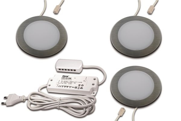 LED-Einbaustrahler mit Flächenlicht als 3er Set, Gehäuse Metall, Anschlussleitung 2,5m mit LED 24-Stecker am Strahler steckbar, Lichtfarbe warm weiß ca. 3000K, incl. steckerfertigem 15W Trafo, schnelle und einfache Montage durch Rasthaken, optionales Zubehör: Dimm-Controller mit Funkfernbedienung, Alexa, WiFi, DALI, ZigBee, Casambi, Sonar oder 1-10V Dimmer
