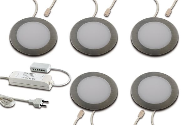 LED-Einbaustrahler mit Flächenlicht als 5er Set, Gehäuse Metall, Anschlussleitung 2,5m mit LED 24-Stecker am Strahler steckbar, Lichtfarbe neutral weiß ca. 4000K, incl. steckerfertigem 30W Trafo, schnelle und einfache Montage durch Rasthaken, optionales Zubehör: Dimm-Controller mit Funkfernbedienung, Alexa, WiFi, DALI, ZigBee, Casambi, Sonar oder 1-10V Dimmer