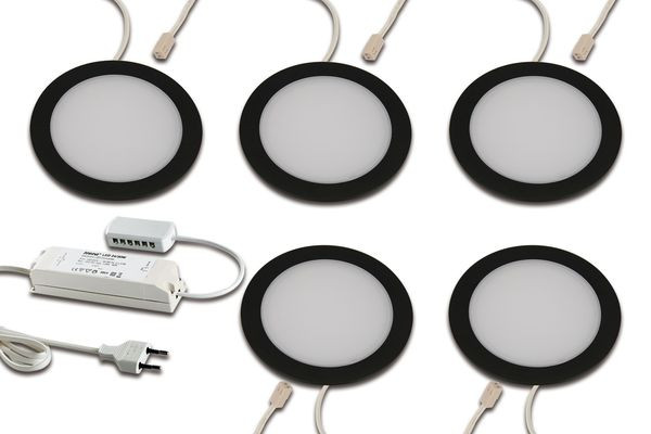 LED-Einbaustrahler mit Flächenlicht als 5er Set, Gehäuse Metall, Anschlussleitung 2,5m mit LED 24-Stecker am Strahler steckbar, Lichtfarbe neutral weiß ca. 4000K, incl. steckerfertigem 30W Trafo, schnelle und einfache Montage durch Rasthaken, optionales Zubehör: Dimm-Controller mit Funkfernbedienung, Alexa, WiFi, DALI, ZigBee, Casambi, Sonar oder 1-10V Dimmer
