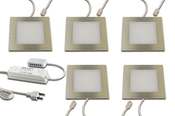LED-Einbaustrahler mit Flächenlicht als 5er Set, Gehäuse Metall, Anschlussleitung 2,5m mit LED 24-Stecker am Strahler steckbar, Lichtfarbe warm weiß ca. 3000K, incl. steckerfertigem 30W Trafo, schnelle und einfache Montage durch Rasthaken, optionales Zubehör: Dimm-Controller mit Funkfernbedienung, Alexa, WiFi, DALI, ZigBee, Casambi, Sonar oder 1-10V Dimmer