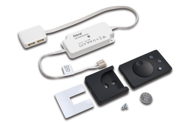 RGB-Controller 24V DC mit beiliegender Anbau-Funkfernbedienung in edelstahloptik und Wandhalterung, mit Memory-Funktion (nach Netztrennung wird der vorherige Zustand wieder hergestellt), inkl. Batterie, Anschlussleitung mit zwei LED 24-Steckern und 4-fach Verteiler