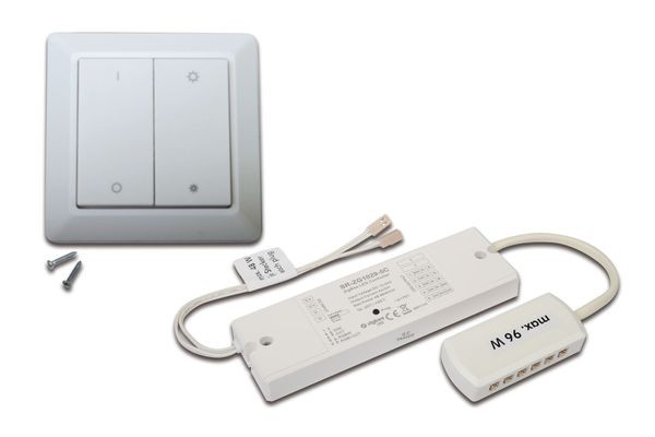 Wandtaster Dimm, kann auf beliebig viele Zigbee / Alexa Controller angelernt werden, mit Piezo-Taster / ohne Batterie, zum Anschrauben oder Ankleben mit beiliegendem Klebepad und kompatibel zu den Rahmen folgender Schalterprogramme: BERKER S1, B1, B3, B7 Glas / GIRA Standard 55, E2, Event, Esprit / JUNG A500, Aplus / MERTEN M-smart, M-Arc, M-Plan