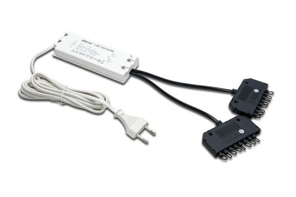 Elektronischer Sicherheitstransformator 350mA, Netzanschlussleitung 2m mit Eurostecker, mit zwei 9-fach Verteiler, max. zulässige Länge der Sekundärleitungen 5m