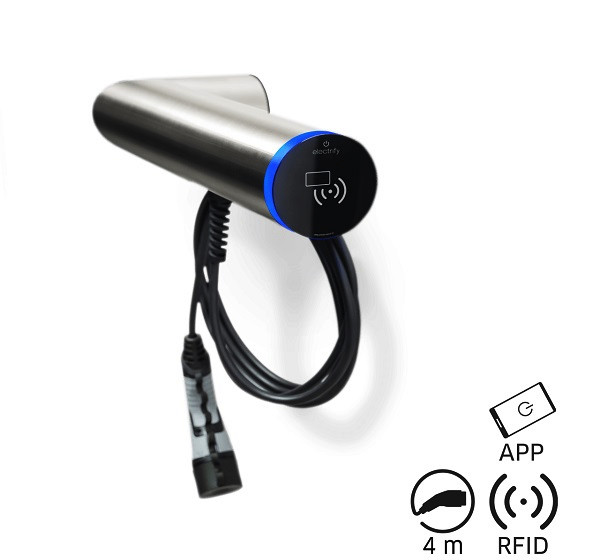 Wallbox, Ausrichtung waagerecht rechts, Ausführung BASE, Edelstahl gebürstet, max. Ladeleistung 22kW, max. Ladestrom 32A, DC-Fehlerstromerkennung, im Innen- und Außenbereich frei positionierbar, Autorisierung über RFID oder Smartphone über eCC App (electrify Charge Control), Plug and Start, WLAN und digitale Eingänge, Master / Slave via electrify Mesh, Modbus TCP, 4 Meter Ladekabel (Typ 2), Klimasystem durch Axiallüfter und Heizung, Schutzart IP 54, einfache Montage, incl. 1x RFID-Karte, Wandadapter zur Aufputzinstallation, Befestigungsmaterial, Adapter digitale Eingänge, Gerätepass, Montagekurzanleitung