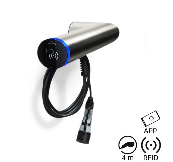Wallbox, Ausrichtung waagerecht links, Ausführung BASE, Edelstahl gebürstet, max. Ladeleistung 22kW, max. Ladestrom 32A, DC-Fehlerstromerkennung, im Innen- und Außenbereich frei positionierbar, Autorisierung über RFID oder Smartphone über eCC App (electrify Charge Control), Plug and Start, WLAN und digitale Eingänge, Master / Slave via electrify Mesh, Modbus TCP, 4 Meter Ladekabel (Typ 2), Klimasystem durch Axiallüfter und Heizung, Schutzart IP 54, einfache Montage, incl. 1x RFID-Karte, Wandadapter zur Aufputzinstallation, Befestigungsmaterial, Adapter digitale Eingänge, Gerätepass, Montagekurzanleitung