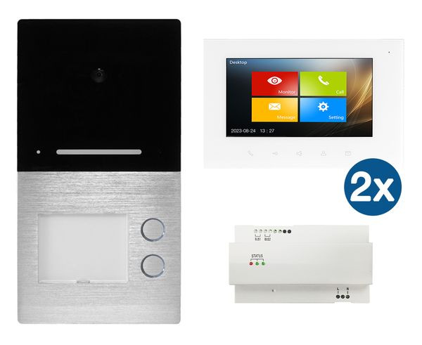 Zweifamilien-Set Villa Video 2-Draht Freisprechanlage, bestehend aus 1x AS AP Türstation Aufputz und zwei Klingeltasten (Aluminiumgehäuse, man. Lautstärkenregler, Kamera mit 1,0 Megapixel und einem Erfassungsbereich von 110?, Tag-Nachtmodul mit LED-Beleuchtung, 2 Klingeltaster mit Namensschild LED-beleuchtet, Anschlussklemmen für Busleitung, potentialfreier Türöffnerkontakt, Potentiometer Türöffnerzeit, Belastbarkeit potentialfreier Türöffnerkontakt max. 1 A 24 V (DC) / 12 V (AC), LED-Rufanzeige, Anschlussmöglichkeit einer externen Türöffnertaste, Abmessungen 192 x 100 x 22 mm) , 2x Villa M Touch-Screen-7" Farbmonitor (Wandhalterung, Freisprechfunktion, Mikrofon, Lautsprecher, Sprech-, Türöffner- und Intercomtaste, für Parallelbetrieb geeignet, Anschlussmöglichkeit eines Etagentasters, Einstellmöglichkeit der Ruflautstärke, unterschiedlicher Klingeltöne sowie Helligkeit und Kontrast, Rufunterscheidung Ruf Intern, Türstation oder Etagentaster, Bildaufnahme mit automatischem Screenshot, SD-Kartenanschluss 2-32 GB für Videoaufnahmen, 4 Monitore parallel je Klingeltaste möglich Farbe: weiß), 1x Villa NG Hutschienennetzteil (für Verteilereinbau, Eingang 230 V, Ausgang 30 V DC für Busleitung, Status ? LED, Abmessungen 144 x 90 x 64 mm / 8 TE)
