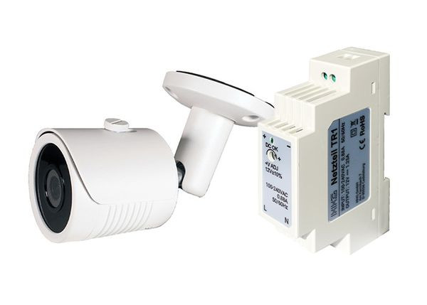 Kamera-Set für Einbaulautsprecher Villa EL, bestehend aus externer Stabkamera, Netzteil und Anschlußkabel, externe Farb-Außenkamera im robustem Gehäuse mit einstellbarem Gelenkarm, mit einer integrierten automatischen Tag-/Nachtumschaltung (Nachtmodus: schwarz/weiß mit IR-LEDs), Hutschienen-Schaltnetzteil 230V AC Eingang, 12V DC, 1A Ausgang, zur Montage auf DIN-Hutschiene 2 TE