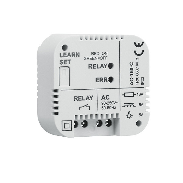 Funk-Schaltrelais für die Unterputz-Montage zum Schalten von Lasten bis zu 250V AC/ 16A. Kopiert den Zustand eines ausgewählten Schaltausgangs des System 9000. Auf welchen Schaltausgang (1 bis 4) das Relais reagiert, wird über die Software eingestellt. Belegt eine Adresse im System. Kann in einer Unterputzdose montiert werden. Alternativ kann das Relais als eigenständiges Funkrelais ohne Zentrale mit den Systemmeldern 9000M, 9000P, 9000R4 (64 Stück je Relais) eingesetzt werden. Es sind dann 5 Betriebsmodi (Kopieren / Status, Impuls, Zustandsänderung, Deaktivieren, Blockieren) einstellbar. Die Programmierung muss über Software und Zentrale erfolgen. Keine Unterstützung über einen Funk-Repeater 9000FR. Spannungsversorgung über L, N Leiter (230V). Belastbarkeit bei ohmscher Last (cos(phi) = 1): max. 16A / 230V. Belastbarkeit bei induktiver Last (cos(phi) = 0,4): max. 8A / 230V. Halogen-Beleuchtung: max 1KW. Minimale DC-Last: 0,5W. Schutzart: IP20. Betriebstemperatur: -10 °C bis + 40 °C, RF 75% nicht kondensierend. Abmessungen: 49 x 49 x 26mm.