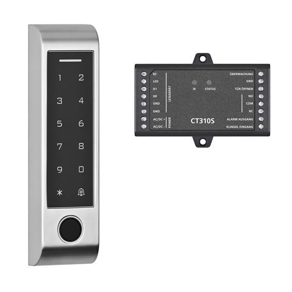 Code-/Transponder-/Fingerprint-Lesegerät zur Aufputzmontage mit abgesetzter Steuerung und WLAN-Zugriff. Bis zu 887 Anwender können mit individuellen 4- bis 6-stelligen Codes, RFID-Transpondern (EM-125kHz- oder Mifare-13,56MHz-Protokoll) oder bis zu 100 Anwender-Fingerabdrücken die Steuerung aktivieren. Beleuchtetes Tastenfeld mit Bestätigungs-LED und -Summer. Hoher Manipulationsschutz durch Abrisssensor und abgesetzte Steuerung mit Datenkommunikation über Wiegand 26-44,56,58 bit Protokoll, Ausgang: potentialfreier Wechselkontakt (Impuls- oder Umschaltmodus wählbar, NO/NC, max. 2,5A / 12V AC/DC, max. 1,25A / 24V AC/DC), Impulsdauer 0-99 Sek. Anschlussmöglichkeit für Überwachungskontakt und externe Klingeltaste. Grundeinstellungen über mitgelieferte IR-Fernbedienung (ausschließlich für Einstellungen). Einfaches Hinzufügen von Anwendern über mitgelieferte Administrator-Karte. Bei WLAN-Verbindung mit einem Router können bis zu 500 Anwender über Tuya Smart App (Android (Play Store, Google-Version) / iOS (App Store), keine Zusage eines Servicelevels) vom Smartphone aus die Steuerung aktivieren (Internetverbindung vorausgesetzt). Der Administrator kann in der App die Anwender verwalten, einmalige und zeitbegrenzte Codes vergeben und die Aktivierungshistorie im Logfile betrachten. Push-Nachrichten können bei Betätigung einer optionalen externen Klingeltaste oder bei Aktivierung der Alarmfunktion erhalten werden. Spannungsversorgung: 12 - 28V AC/DC, Stromaufnahme: max. 300mA/12V DC. Lesegerät in stabilem Metallgehäuse aus Zink-Legierung mit 90cm 10-adrigem Anschlusskabel. Schutzart: IP66. Betriebstemperatur: -30°C bis 60°C. Abmessungen: 44 x 165 x 22mm. Steuerung in ABS-Kunststoffgehäuse zur Innenanwendung. Abmessungen: 91 x 49 x 21mm. Passendes Zubehör: 9000TAG(1 bis 6), 9000CARD, VT200TAG1, Klingeltaste KTE01, Klingeltransformator KTR8-12/1500, Steckernetzgerät NG1000, UP-Netzgerät ORBIT-12/2000V, Hutschienen-Netzteil NGH12/1200, passende Spannungsversorgung für einen Türöffner muss ebenfalls berücksichtigt werden.