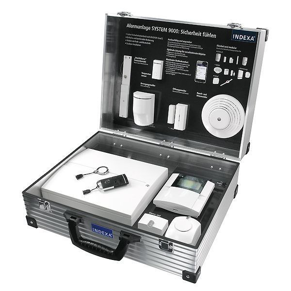 Präsentationskoffer inkl. Funk-Alarmzentrale 9000ZF, Bus-Bedienteil 9000TD, Funk-Innensirene 9000IS, Funk-Öffnungsmelder 9000MX, Funk-Öffnungsmelder 9001ME, Funk-Bewegungsmelder 9000P, RFID-Chip 9000TAG6, Fernbedienung 9000R4, optische Anzeige 9000ANZ, Notstromakku HP13. Mit Leergehäuse des Funk-Rauchmelders 9000S. USB-Kabel beigepackt, N-Link-Software nach Registrierung bei Indexa erhältlich. Abmessungen: 448 x 200 x 350mm.