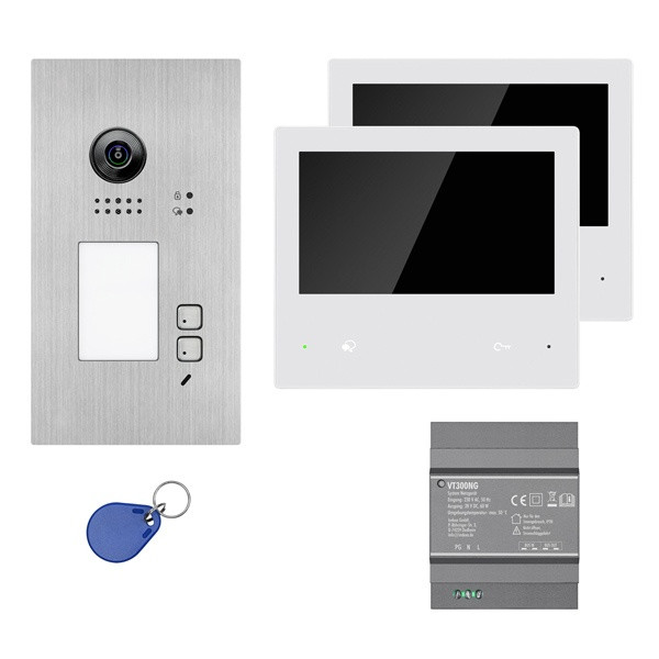 Video-Türsprechanlagen-Set Zweifamilienhaus bestehend aus Türsprechstelle VT300TU2, zwei Innenstationen VT300MW, Systemnetzgerät VT300NG und einem Transponder VT300TAG1. Türsprechstelle VT300TU2 zur Unterputzmontage, mit zwei Ruftasten und Frontplatte aus 2mm gebürstetem Edelstahl (IP54, Schlagfestigkeit IK07). Mit 170° Super-Weitwinkel-Farbkamera (Bildausschnitt und Zoomstufe individuell einstellbar), Weißlicht-LED-Ausleuchtung über beleuchtetes Namensschild (bis ca. 0,8m). Integrierte Transponder-Leseeinheit (RFID EM 125KHz sowie Mifare 13,56MHz) zur Ansteuerung eines Relaismoduls für einen Türöffner. Akustische und optische Signalisierung der Türöffnung. Eine Ruftaste kann als Alternative zur Anruffunktion zur Ansteuerung eines Lichts über das Relaismodul VT300R verwendet werden. Video-Innenstationen VT300MW mit 7 Zoll IPS-Touch-Bildschirm (sichtbare Bilddiagonale 17,6cm), Freisprechfunktion, 20 auswählbaren Klingeltönen und integriertem Ringspeicher für die letzten 50 Videoaufnahmen (Aufnahme von 3-sekündigen Videos automatisch bei Anruf). Router-Verbindung über in die Innenstation eingebautes WLAN-Modul ermöglicht Rufweiterleitung mit Bild-Darstellung auf Smartphone-App (FRITZ!Box empfohlen). App für iOS (App Store) und Android (Play Store, Google-Version) kostenlos erhältlich (nicht Teil des Produkts, keine Zusage eines Servicelevels). Jeweils inkl. Anschlusskabel für Etagenruftaster, sowie für Zusatzsummer (12V DC, max. 50mA) oder Funk-Klingelerweiterung. Bildschirmauflösung: 1024 x 600 Pixel. Pro Ruftaste können max. eine Innenstation als Hauptinnenstation und drei als Nebeninnenstationen betrieben werden. Digitaler 2-Draht-Bus-Anschluss an das mitgelieferte VT300 Systemnetzgerät. Zusätzliche Kameras sind integrierbar. Lieferung inkl. Transponder-Chip VT300TAG1 im Schlüsselanhänger-Format. Abmessungen Türsprechstelle: 120 x 220 x 2mm (Frontplatte), 105 x 208 x 48mm (mitgelieferter Unterputzkasten). Abmessungen Innenstation: 185 x 160 x 18mm. Passendes Zubehör: weitere funktionsgleiche Türsprechstellen VT300TA / VT300TU1-4 / VT300T1, Innenstationen VT300MB, Transponder-Chips, Tischhalterung VT300SM2, Relaismodul VT300R (zur manipulationssicheren Ansteuerung eines Türöffners), LAN-Schnittstelle VT300LAN für Einbindung von passend eingestellten Netzwerkkameras über LAN, zusätzliche Kamera VT300K (über Bus integrierbar).