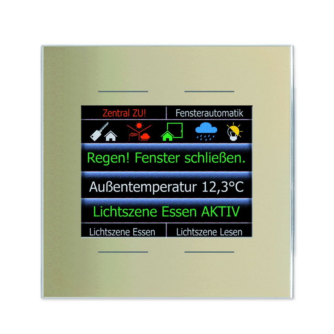 Das LCN-GT4D ist ein Info-Tastenfeld mit TFT-Display. Es wird per mitgeliefertem Montageplatte auf eine UP-Dose montiert und mit einem Schieber fest verankert. Der Anschluss erfolgt über den I-Anschluss des beiliegenden LCN-Netzteils LCN-NUI und einem LCN-Busmodul ab Version 140719 (Juli 2010). Im Sensortastenfeld LCN-GT4D ist ein Temperatursensor integriert. Dank einer Auflösung von 0,1°C und einer adaptiven Mittelwertbildung liefert er praktisch rauschfreie Messwerte. Die 4 kapazitiv arbeitenden Sensorflächen sind hinter einer 5 mm starken Glasfront angeordnet. Eine leichte Berührung der Oberfläche genügt, um verschiedene Funktionen auszulösen. Zusätzlich bietet das LCN-GT4D einen Corona®-Lichtkranz mit weißen LEDs für die Wandbeleuchtung. So lässt sich das LCN-GT4D auch bei geringem Umgebungslicht komfortabel bedienen. Die Sensorflächen lassen sich auf dem Display digital beschriften. Auf dem Display sind verschiedene Arten der Darstellung möglich. Symbol-Zeile: Es können maximal 6 Symbole in der oberen Bildschirmzeile angezeigt werden. Diese Symbole werden einem Binäreingang, Relais, Ausgang oder Logik-Funktion zugeordnet und reagieren auf dessen Statusmeldung. Text-Zeile: In jede der 3 Textzeilen können max. 63 Zeichen eingegeben werden, davon sind 19-23 Zeichen sichtbar (Autoscrollfunktion) bei Verwendung einfacher Zeilenhöhe. Die Textzeilen 1-3 können auch auf doppelte Zeilenhöhe eingestellt werden und belegen dann 2 Zeilen. Tasten-Beschriftung: Für die 4 Tasten kann ein Beschriftungstext eingegeben werden. Der Text kann max. 25 Zeichen lang sein (ohne Autoscrollfunktion). Alternativ kann das Display auch 4 Textzeilen anzeigen, wenn die Tastenbeschriftung nicht benötigt wird. Das LCN-GT4D spricht acht Sprachen: Deutsch, Englisch, Französisch, Spanisch, Polnisch, Türkisch, Russisch und Arabisch, die im Betrieb umgeschaltet werden können.