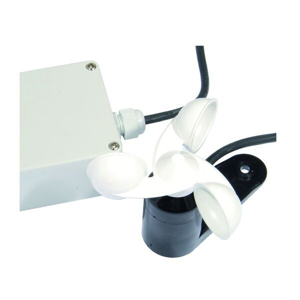 Windsensor (Windrad) mit Impulszählerkabel und integriertem LCN Busmodul zur Auswertung der Zählimpulse des Sensors, die Parametrierung des LCN Busmoduls erfolgt durch die Systemsoftware LCN-PRO, das Gehäuse ist entsprechend witterungsbeständig ausgeführt und verfügt über eine etwa zwei Meter lange Anschlussleitung, einem IP65 Gehäuse für das LCN Busmodul wie auch Montagezubehör zur Wand- oder Mastbefestigung