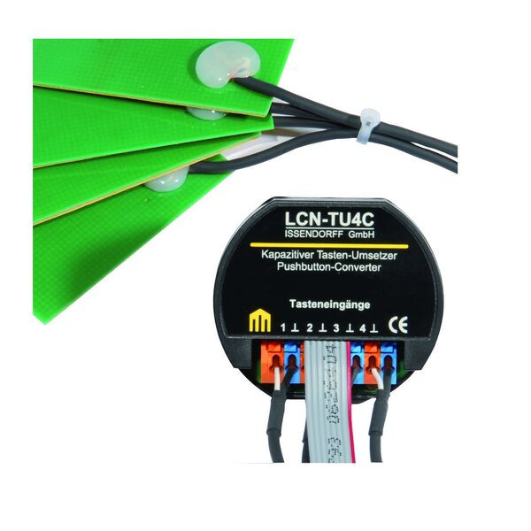 eröffnet eine ganz neue Möglichkeit, Tasten unsichtbar zu realisieren, er ermöglicht bis zu vier Sensorflächen kapazitiv abzufragen, jede der 4 Tasten besteht aus einer Folie, die hinter Holz, Naturstein, Fliesen, usw. geklebt werden kann, die Sensortasten werden bedient durch einfaches Berühren der Oberfläche, der LCN-TU4C ist vorgesehen zum Einsatz mit dem LCN-UPP oder UPS Modul, kann aber auch am LCN-HU, LCN-SH und LCN-LD verwendet werden, natürlich stehen alle LCN-Funktionen mit 3 Befehlen für jede Taste (Kurz / Lang / Los) zur Verfügung