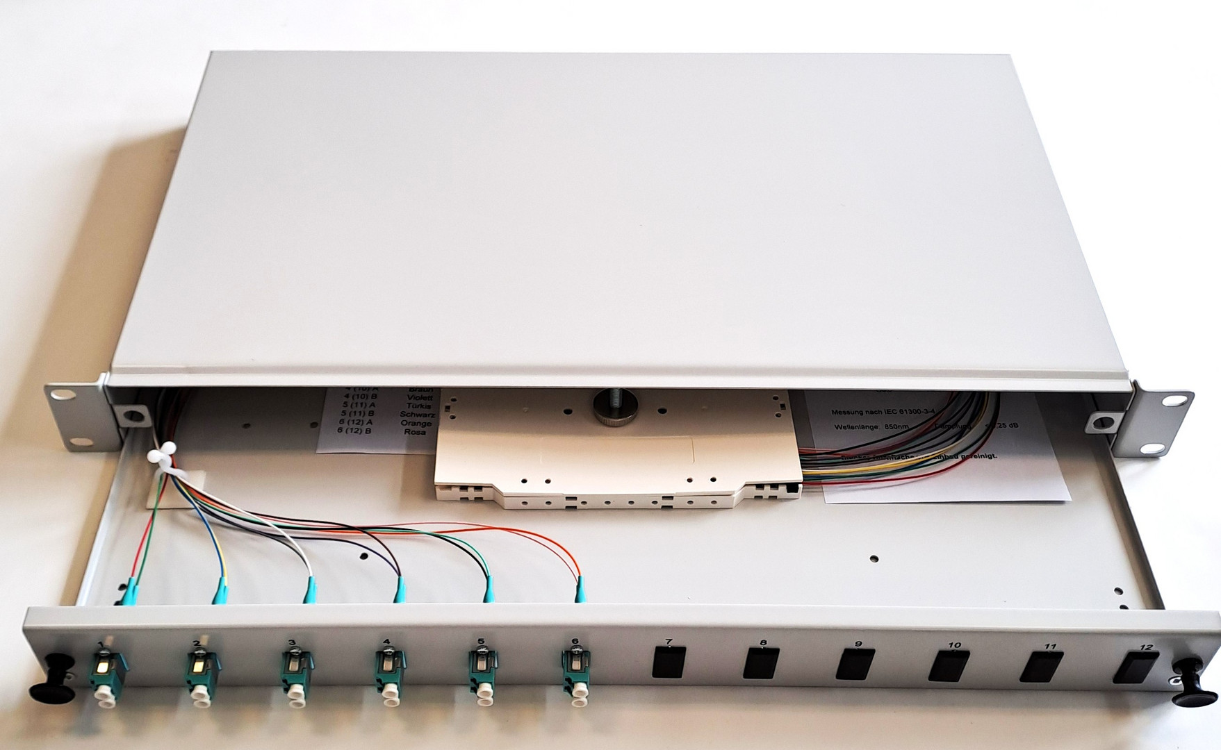 Spleißbox 19" 1HE für 12 x LC-D, ausziehbar (Schublade), tiefenverstellbar, RAL7035, inkl. 6 Stück Kupplungen LC/LC-D MM aquamarin, 6 Stück Blindstopfen, 1 x Spleißkassette mit Zugentlastung, Spleißhalter, Deckel, 1 x Verschraubung PG16, Pigtails G50/125µ OM3, LC/UPC, farbig, 2m, abgesetzt und aufgelegt